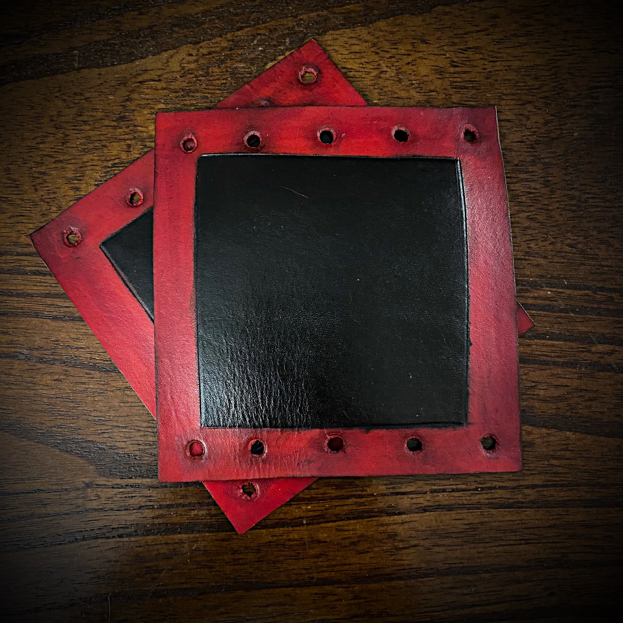 Made of 10oz weight, thick leather. Tied in the back with leather lace.